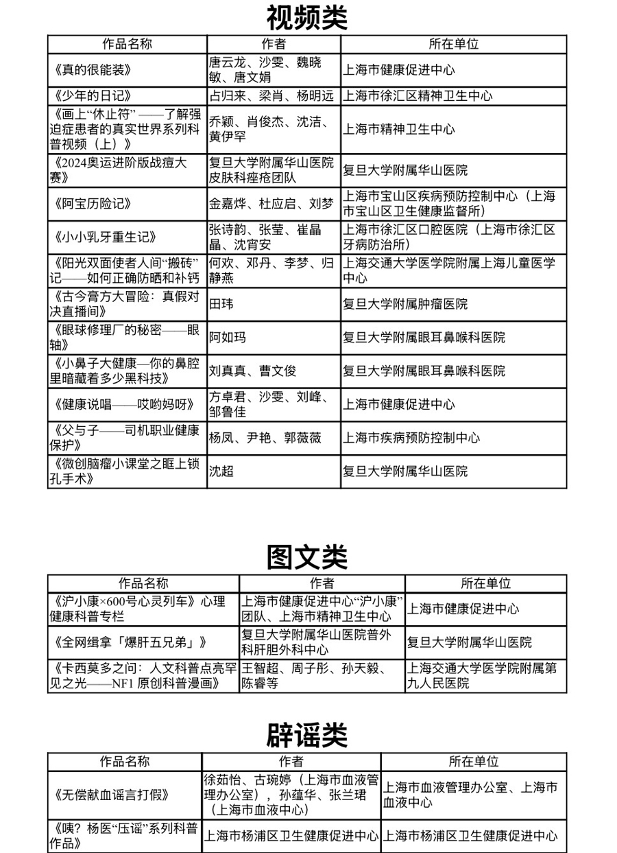近日,由国度卫生健康委等举办的“2025年新期间健康科普作品搜集活动”评比成果揭晓,上海有18件科普作品荣获优秀奖项,其中视频类13件、图文类3件、辟谣类2件。此外,上海市卫生健康委和市血液中心因组织责任出色,获通报表扬。上海健康科普发达隆起,彰显科普立异力。