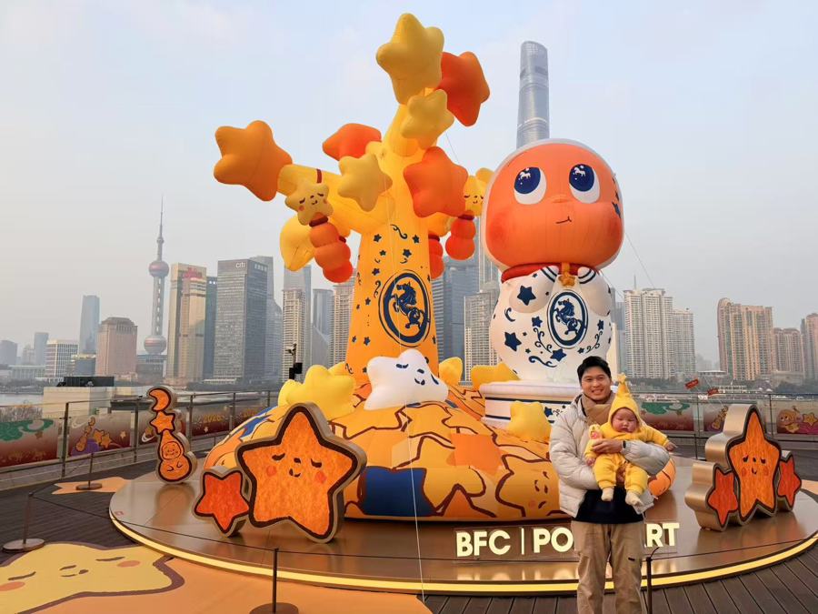 无零碎偶,2月1日,星星东说念主“披露”外滩。BFC外滩金融中心化身巨型泡泡玛特乐土,南区5楼露台,“星梦迎春”安装以青花瓷为灵感,橙红色的星星东说念主穿上了饰以骏马和五角星斑纹的青花瓷套装,背后正好是绝佳的浦江风光,陆家嘴“三件套”与东方明珠塔尽收眼底。