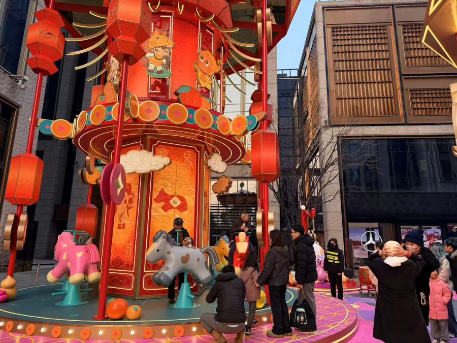 与此同期,外滩另一端,泡泡玛特的几大热点IP则换上了喜庆的新颜。2月1日起,BFC荟萃泡泡玛特推出“新春游园会”,这是2026上海豫园灯会的灯区之一,主打“习尚潮水”,不消购买灯会门票亦可进入。北区广场上,一座会通传统飞檐与暖黄灯箱的朱红色“宫灯旋转木马”安装尤为吸睛。仔细看去,灯箱上画图的密致录取画卷中,藏着PUCKY、SKULLPANDA等十二个泡泡玛特经典IP的身影,跟着木马旋转,勾画出马年奔腾的祯祥意想,一旁还有LABUBU的萌趣灯组逸态横生。