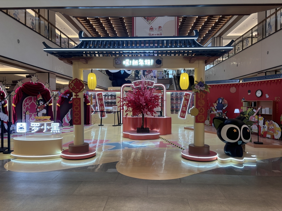 旧年年底在苏河湾万象六合东里通达的“嘿!新年好!”罗小黑新春主题快闪,也采选了“IP+快闪店”的口头。LG2中庭,一棵缀满道喜丝带的红粉色“许诺树”引东说念主真贵,树下荟萃着拍照、集章的年青东说念主。两侧搭建了不同的安装场景,左侧犹如一座微型舞台,罗小黑、无尽等动漫脚色纷纷摆出标志性Pose。右侧则呈现充满生存气味的局面:师傅无尽气定神闲地翻书,一旁化成东说念主形的罗小黑却七手八脚,阁下手各端着装得满满当当的托盘,身体后仰、形势张皇,眼看就要“翻车”。
