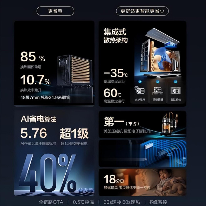 在性能上,这台机型的制冷制热速率更快,双排铜管+全直流变频的组合,让它在高温或低温环境下依然康健运行,维持-35℃~68℃宽温域,对极点天气更有适合力。