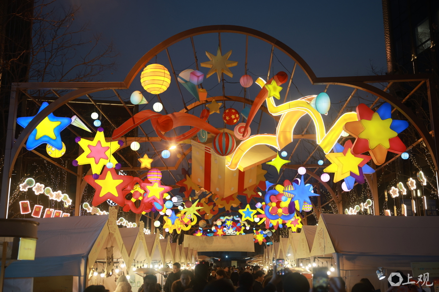 在BFC露台,星星东谈主-星梦迎春安装温馨点亮。动作点金奔腾系列的形象,该形象灯组以青花瓷为创作灵感,铺伸开一幅诗意的新春画卷:幽蓝枝蔓与星点同一,照射出骏马抬头飞奔银河的英姿,鬃尾轻扬间散落剔透微光。星星东谈主化身为瓷上灵动祥纹,或嬉戏星间,或伴马共舞,以青花笔触勾画好意思好期望,借熠熠星光传递至意祝愿。