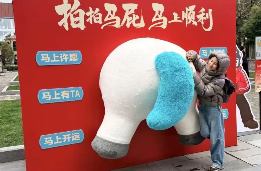 现场,一座专为马年打造的“极光蓝道喜开运马”艺术安装最初映入眼帘,参与者系上道喜丝带、摇响开运铃铛,寓意新年“马到到手”。