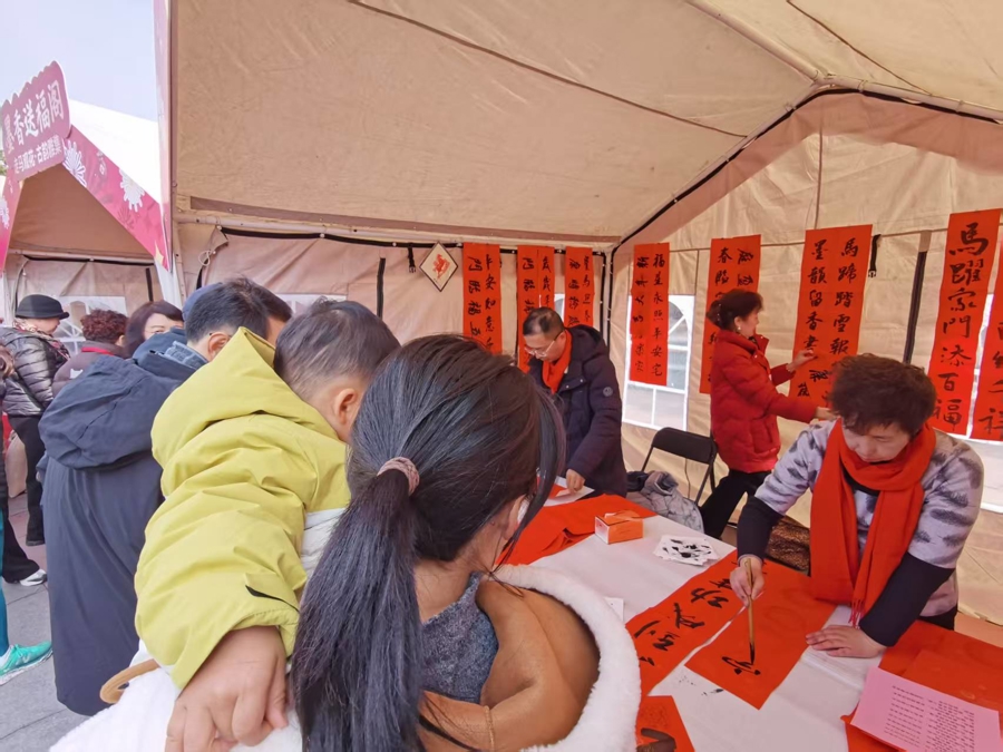 写对联送福字,现场迎新氛围浓厚。文禀报记者 单颖文摄