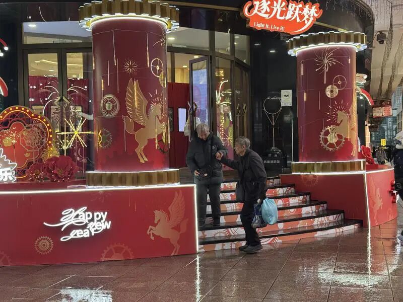 1月23日下昼,记者在第一百货生意中心门口看到,其初学台阶共五级,每级台阶高度约15厘米,坡度较陡,附近无扶手和无阻截坡说念,仅在门前栽培了一块“严防台阶”的警示牌,老东说念主出入时只可从台阶高下。再往前走则是食物一店,这里相差的老年主顾更多。记者不雅察发现,要参加食物一店,需要先上一级台阶走到大门口,门口又有四级大理石台阶,每级高度约15厘米,总高60厘米,台阶旁莫得诞生任何扶手或坡说念提拔时代。记者驻防到,由于阛阓大门与台阶之间缓冲区域较短,主顾掀帘而出后仅两步便濒临下台阶。多名老东说念主走出时彰着瞻念望,脚步放缓,后方客流当场积压,造成倏得拥堵。一位推袖珍购物车的老东说念主不得不侧身横拉小车,一级级徐徐挪下。