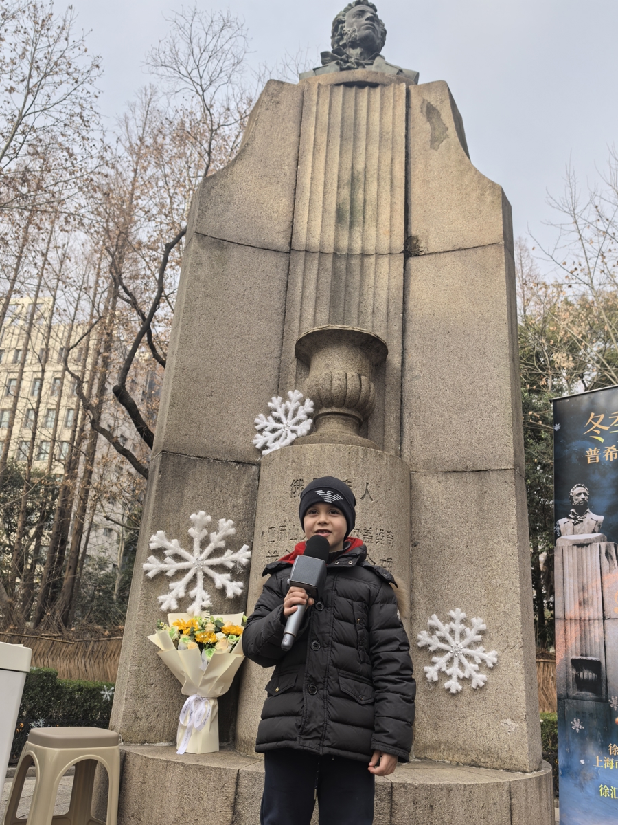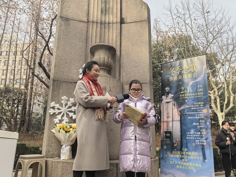 在徐汇区汾阳路、岳阳路路口,梧桐环绕的小小花圃,静静伫立着普希金铜像。2月1日下昼,优好意思的中俄双语诗歌朗读在这里响起。有“俄罗斯诗歌的太阳”之誉的普希金穿越时空,与上海的文艺街区撞个满怀。这场以“冬季恋歌”为主题的普希金诗歌会,蛊惑了数百名市民和搭客驻足凝听。