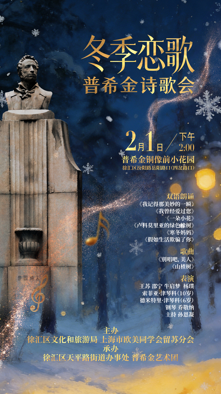 作为由徐汇区文旅局、上海市西洋同学会留苏分会伙同主持、天平路街说念和普希金艺术团经办。主持方从普希金数百首诗歌中罗致了多首脍炙东说念主口的抒怀诗,包括《我紧记那机密的刹那》《我依然爱过你》《假如生存糊弄了你》等,进行双语演绎。