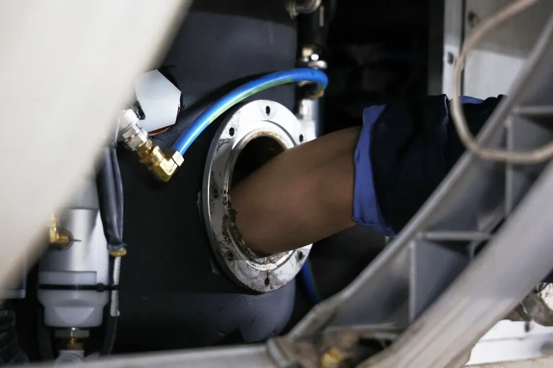 ▲地勤机械师严芝科和张浩准备翻开动车茅厕中转箱。