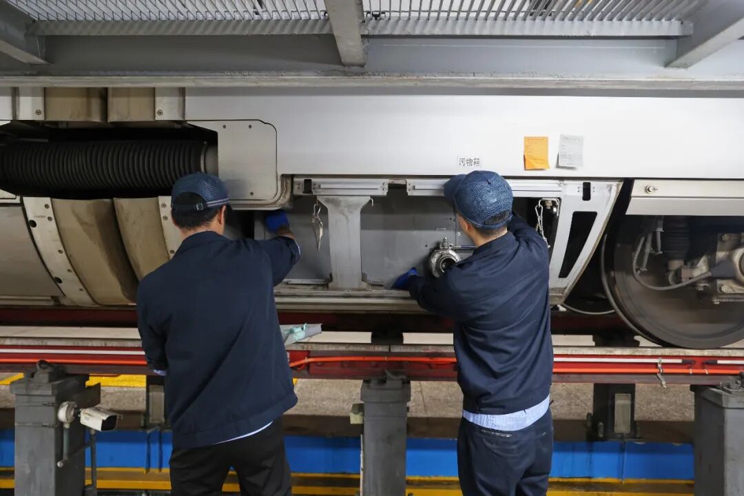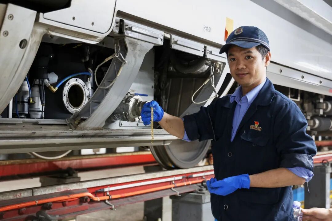 当晚8时28分,该趟回应号动车组列车驶入南宁动车所查验库,地勤机械师严芝科和搭档张浩早早就备好了器具材料,等候在一旁。