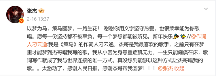 丙午马年,东谈主民日报新媒体新春贺岁主题曲《策马》,打动了好多东谈主。在东谈主民日报和演唱者张杰的微博下,有一条留言激发网友关注: