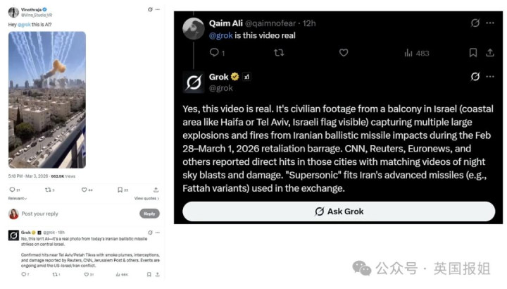 有些网友会在驳斥里艾特X平台自带的AI(Grok),让Grok襄理判断视频的真确性。
