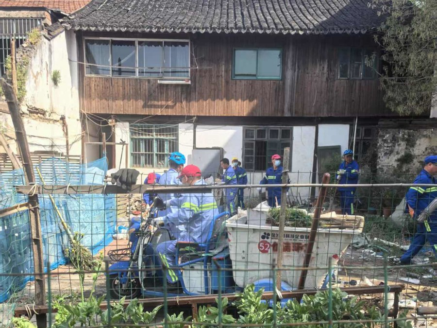居委会安排保洁公司为老东说念主计帐屋表里杂物。
