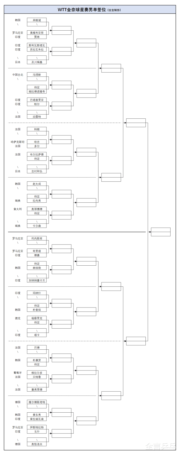 2026年2月11日,印度举办的乒乓球WTT金奈球星赛男单正赛抽签结果已经出炉,在国乒全体缺席、世界排名前二十选手都不参加的情况下,韩国小将吴晙诚、德国世界冠军奥恰洛夫成为前二号种子分守上、下半区,瑞典世界冠军卡尔森在上半区,虽然高手不多但也可能爆发恶战,更多详情请看下文。