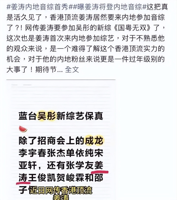 近日在内地应对网流传香港东谈主气男星姜涛将首度踏足内地综艺,加盟音乐节目《国粤无双》。