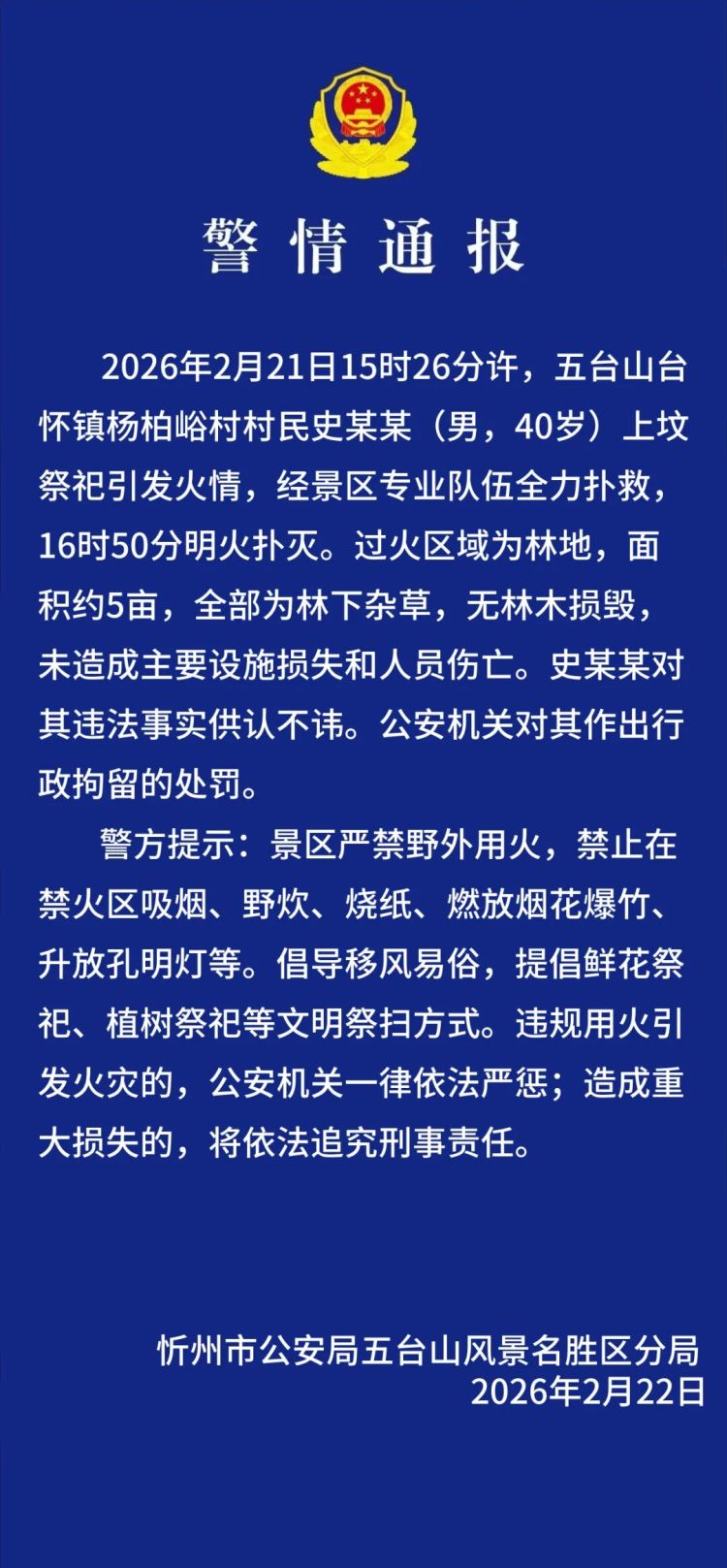 2026年2月21日15时26分许,五台山台怀镇杨柏峪村村民史某某(男,40岁)上坟祭祀激发火情,经景区专科队伍全力扑救,16时50分明火扑灭。及其区域为林地,面积约5亩,沿途为林下杂草,无林木损毁,未变成主要体式损成仇东谈主员伤一火。史某某对其犯科事实供认不讳。公安机关对其作出行政拘留的处罚。