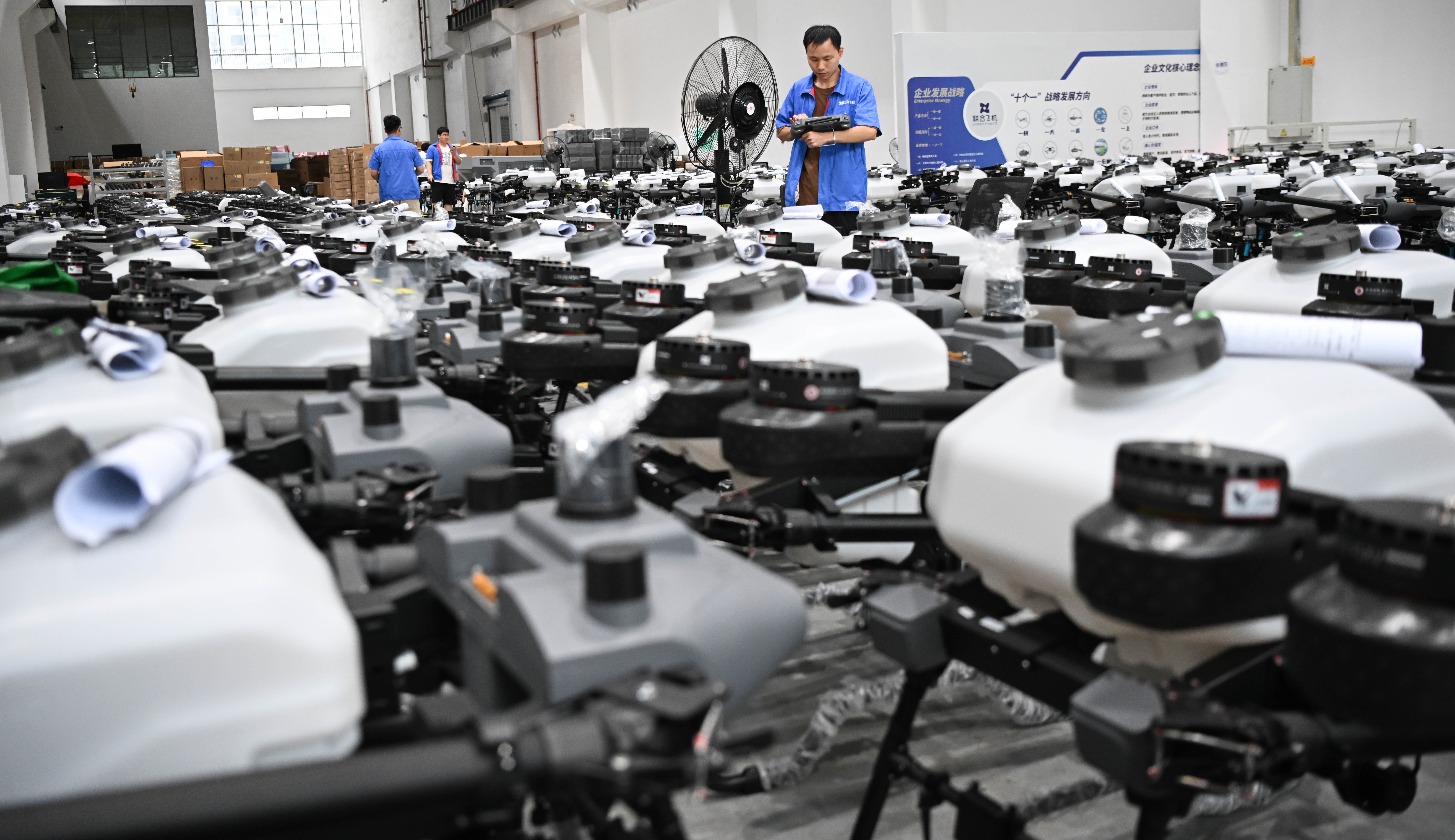 2025年6月26日,使命主谈主员在诱骗飞机集团深圳基地植保无东谈主机仓库内考核。新华社记者 邓华 摄