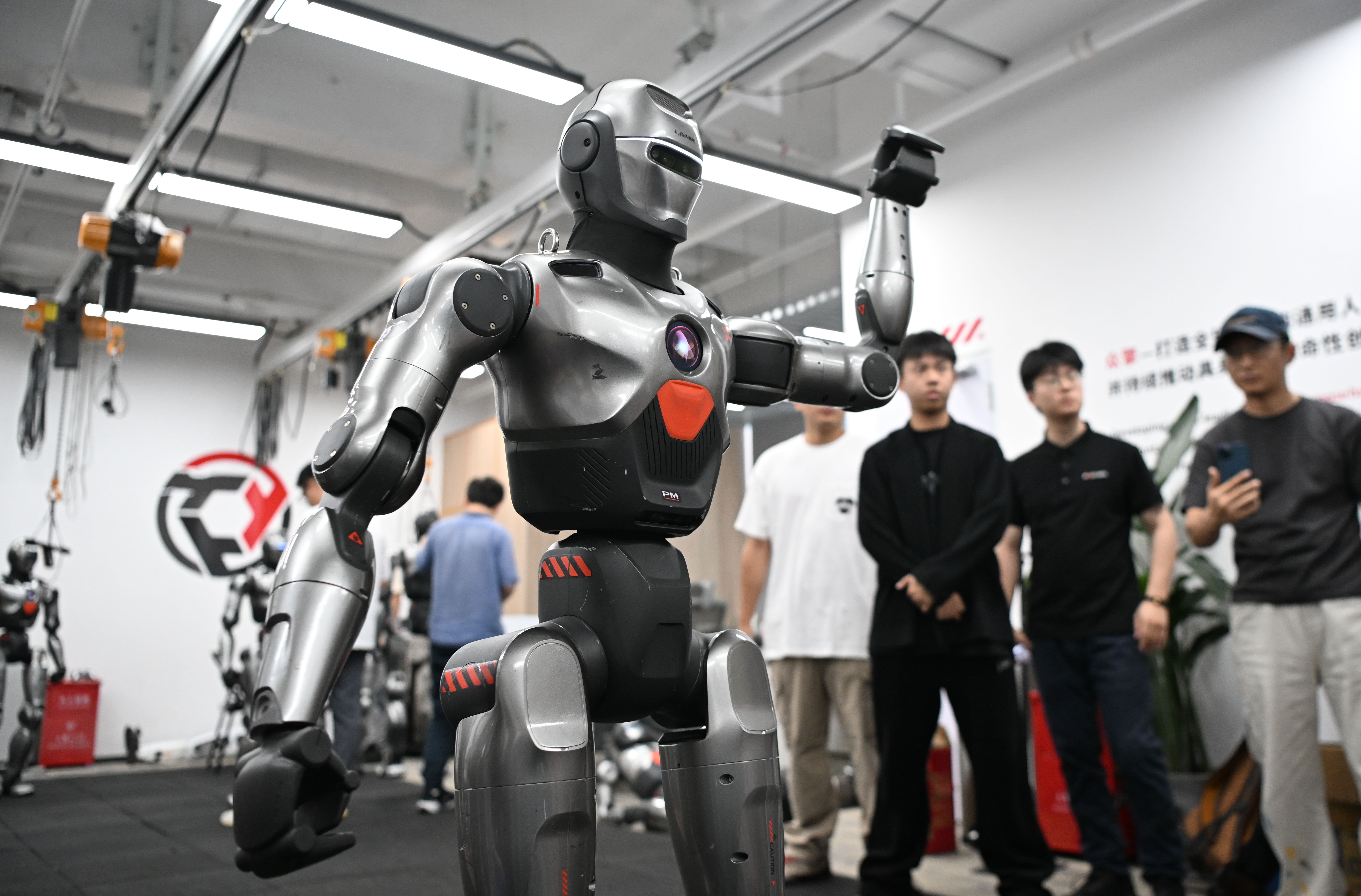 2025年6月25日,在深圳市众擎机器东谈主科技有限公司,东谈主形机器东谈主挥舞手臂问候。新华社记者 邓华 摄
