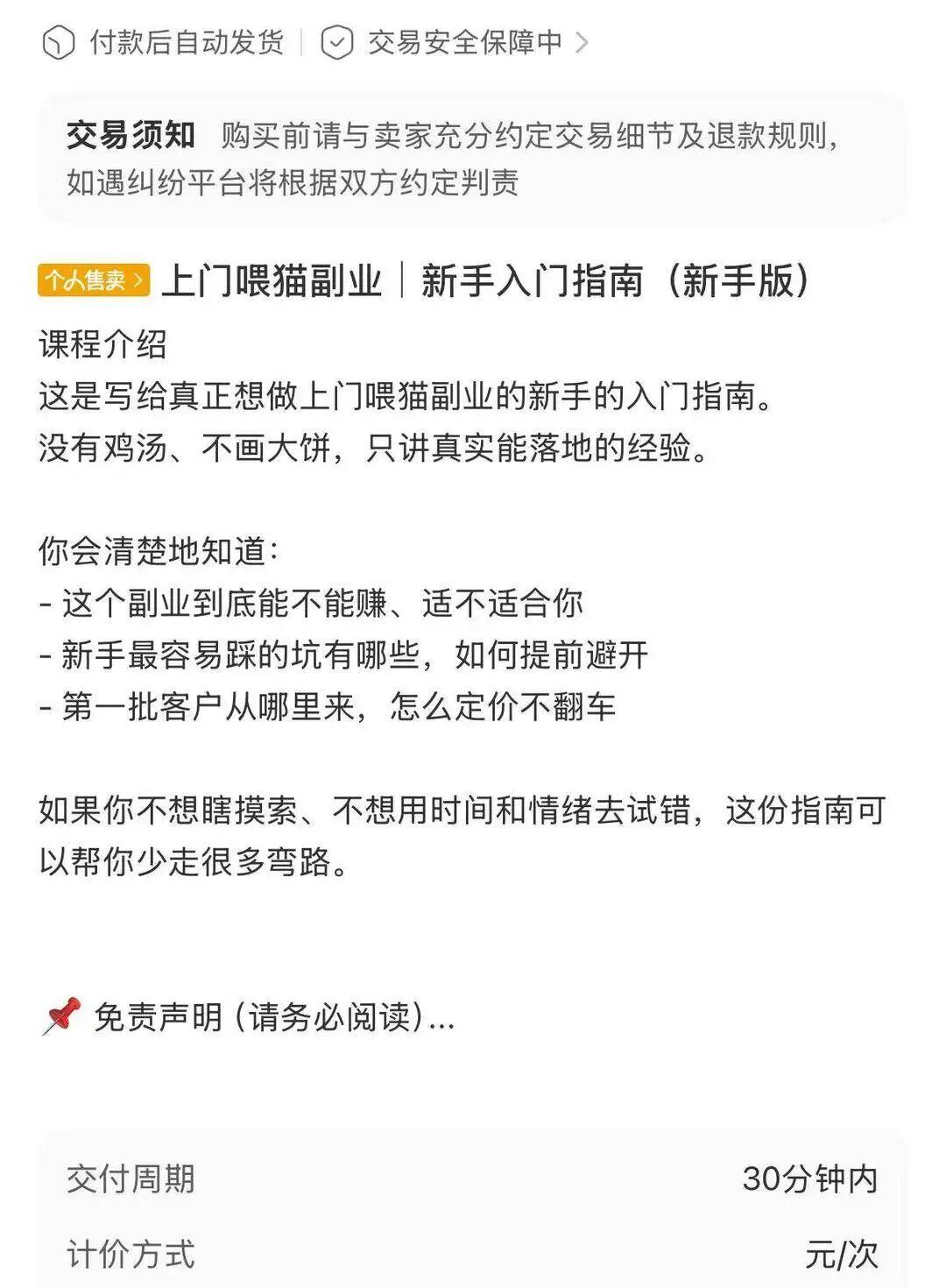 记者不雅察到,如今的上门喂养商场,早已开脱早期“赚点零用钱”的单一定位,成为不少东说念主设备第二收入的进攻选拔,业绩群体也愈发庸碌。“旧年全年靠这个副业收入有2万元以上,淡旺季互异十分明显,旺季基本都汇集在春节、国庆这些长假时候。”小高的订价摄取“基础套餐+个性化涨价”的形态,5公里内基础业绩55元/次,涵盖喂食、换水、铲屎、15分钟宠物互动及居家环境基础搜检,多管理一只猫加收5元,无电梯的楼梯房则迥殊收取5元业绩费等等。
